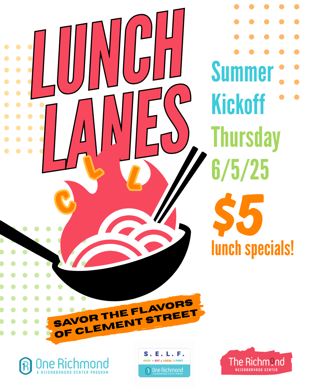 The Clement Lunch Lane initiative launches today, offering a delicious opportunity to explore the rich culinary diversity of the Richmond District while supporting local restaurants. This new program highlights participating eateries along Clement Street from 19th to 26th Avenue, where each restaurant will offer exclusive lunch specials to attract more customers and boost local business. To kick things off, we're hosting a launch event this Thursday June 5 from 12–2 PM on Clement Street in Outer Richmond. Many local businesses will be offering $5 lunch meals to celebrate! It’s a super exciting way to mark the first day of summer break, and we’d love for our families and neighbors to join in the fun.