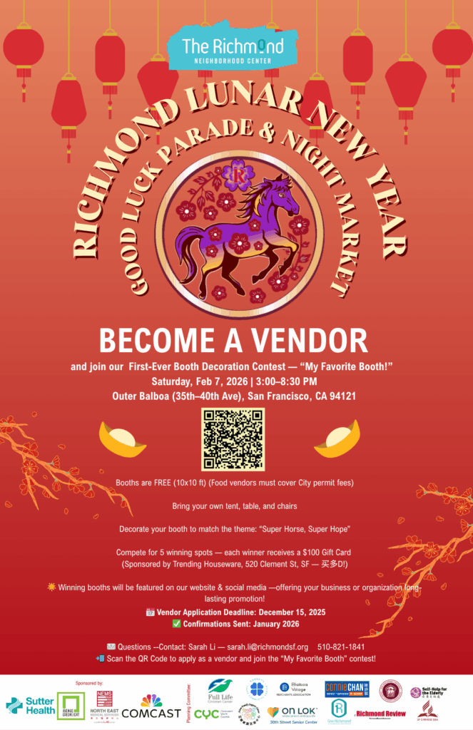The Year of the Horse symbolizes energy, strength, and forward momentum. Inspired by this, “Super Horse – Super Hope” celebrates the Richmond District’s shared aspirations for a brighter year ahead. Just as the horse gallops with vitality and determination, this event invites schools, community-based organizations (CBOs), and community groups to bring joy, creativity, and festive spirit to families and neighbors throughout the Richmond District.